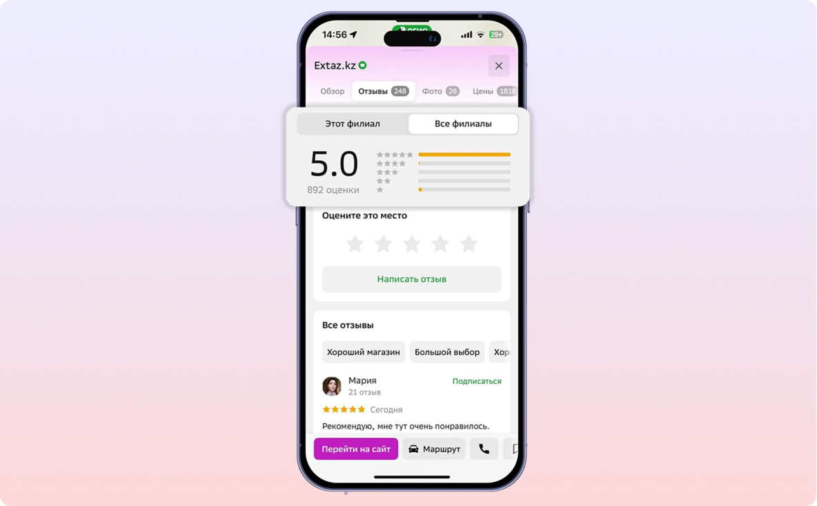 Фото, посты и сторис для карточек в геосервисах у Extaz.kz уникальные — контент не дублируется из соцсетей, а адаптируется под требования карт.