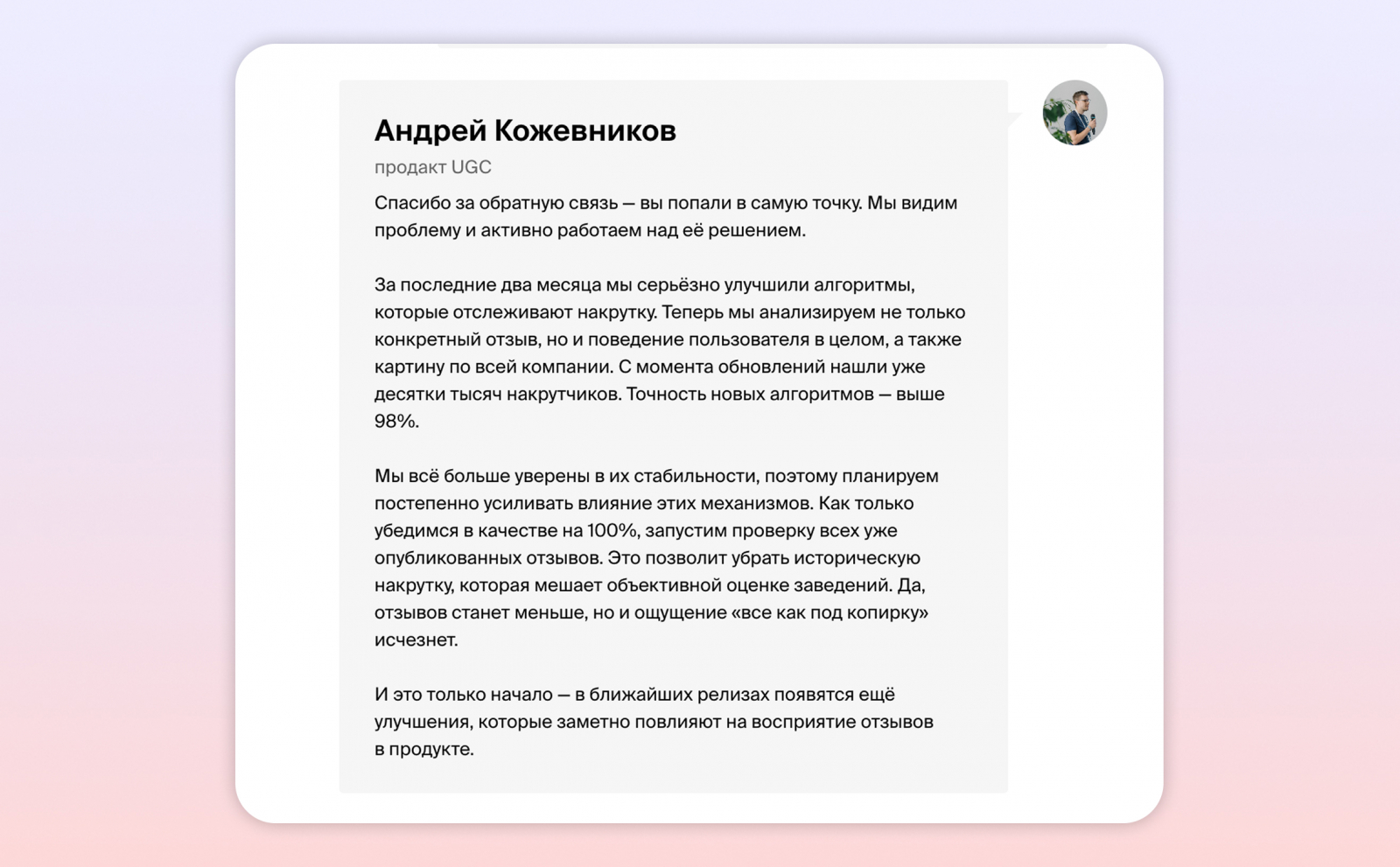По словам команды 2ГИС, за последние два месяца алгоритмы серьезно доработали: уже выявлены десятки тысяч накрутчиков, а точность новых моделей превышает 98%.