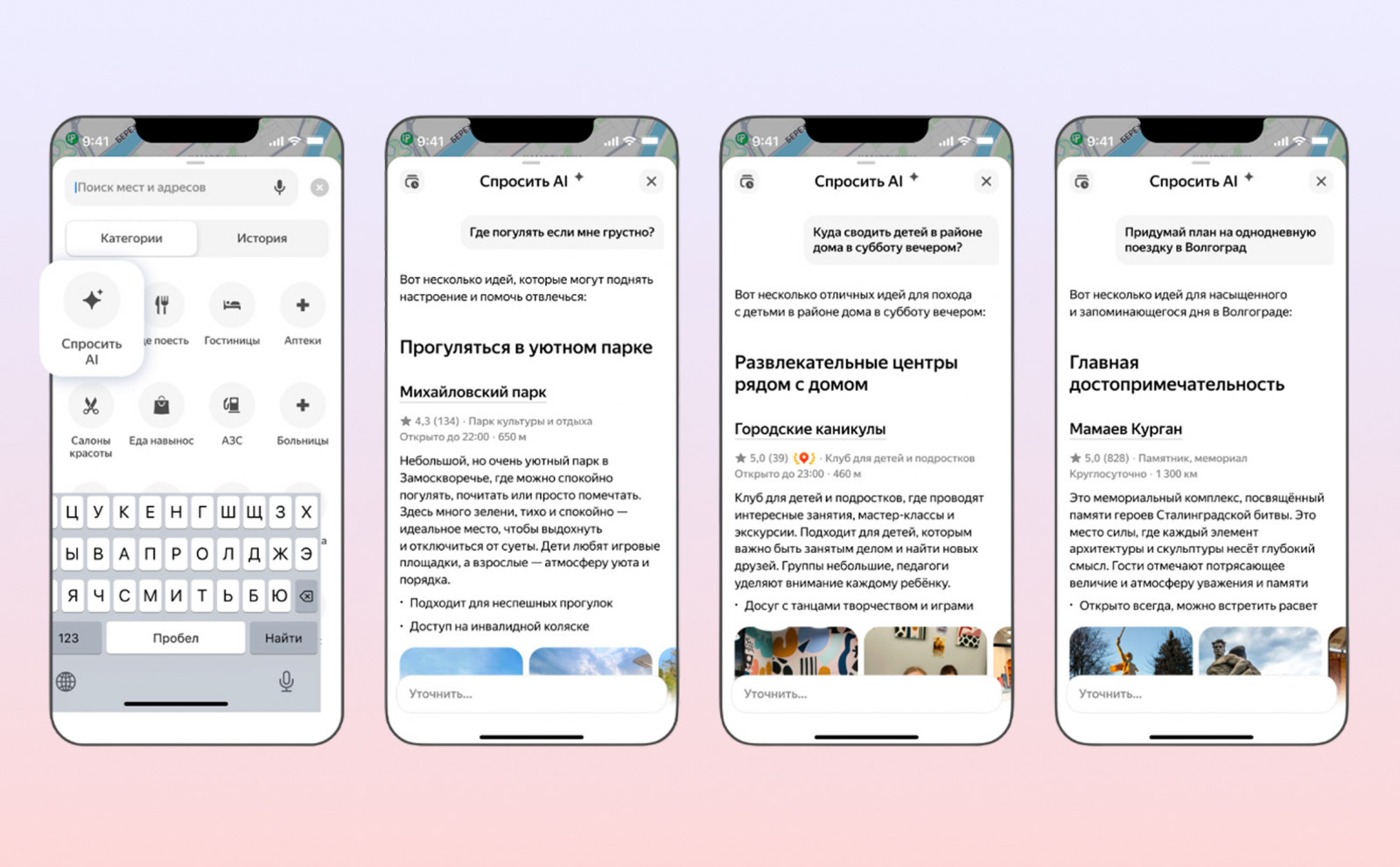 Это ИИ-помощник, встроенный в Карты и навигацию. Он помогает решать городские задачи: выбирать места, планировать день и сразу переходить к действиям.