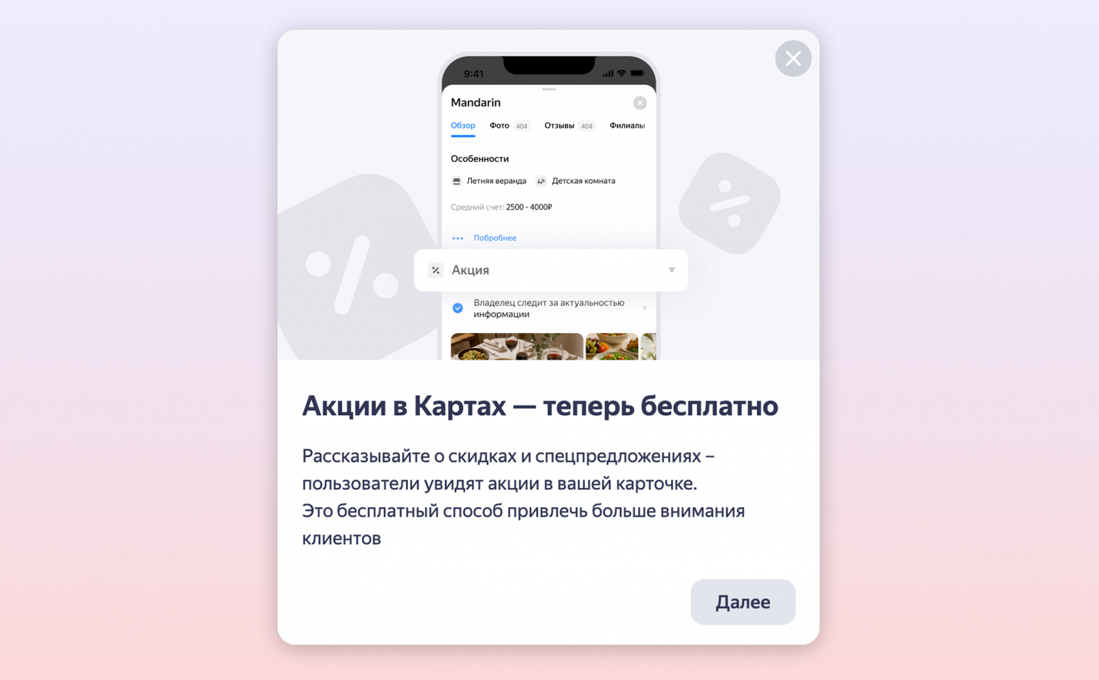 В интерфейсе Яндекс Бизнес изменили логику управления акциями. Теперь все акции создаются и редактируются в разделе «О компании». Старый раздел для акций скоро станет недоступен. На отображение уже опубликованных акций в Картах это не влияет.