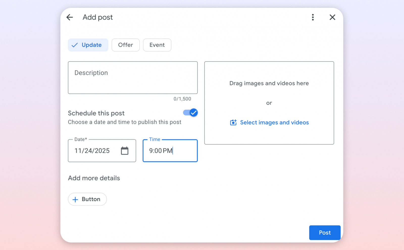 Google добавил два новых инструмента для работы с постами в бизнес-профилях: планирование публикаций и массовое размещение постов для нескольких локаций.