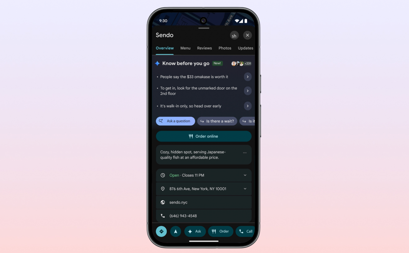 Новый информационный блок появляется при поиске мест и показывает практические советы о заведении: парковка, вход, популярные позиции в меню, лучший способ бронирования и другие детали.