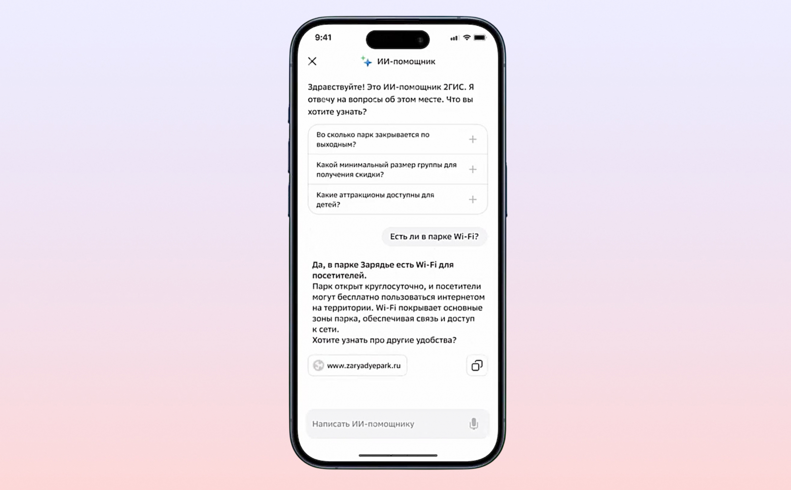 Помощник анализирует справочник, фото и отзывы, и выдаёт короткий, понятный ответ. Работает везде: в кафе и театрах, клиниках, парках и других местах, которые есть на карте.