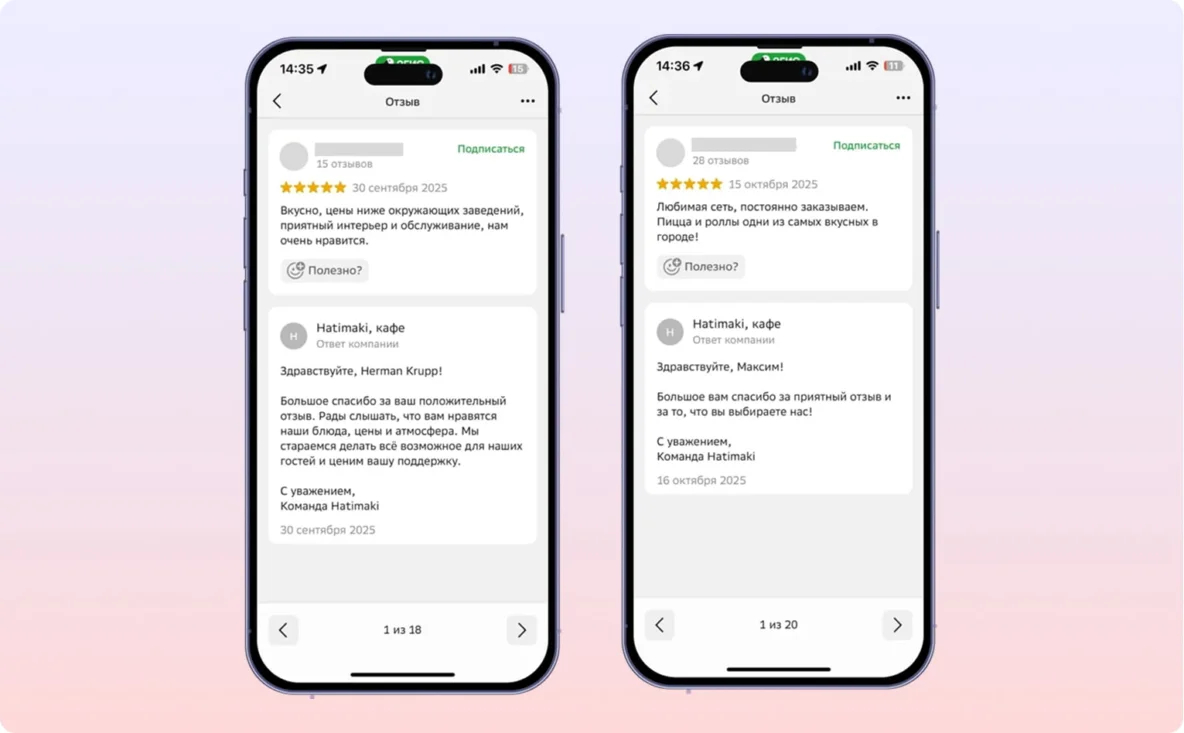— Мы не только обжалуем нерелевантный негатив, но и отправляем клиентам push-уведомления c просьбой оставить отзыв за небольшой подарок. Вместе это работает отлично: мы защищаем свой рейтинг и за счет обжалования, и за счет параллельной генерации отзывов, — отмечает команда маркетинга сети. Так, за первый месяц в карточках Hatimaki количество отзывов выросло в 2 раза — и продолжает планомерно расти.