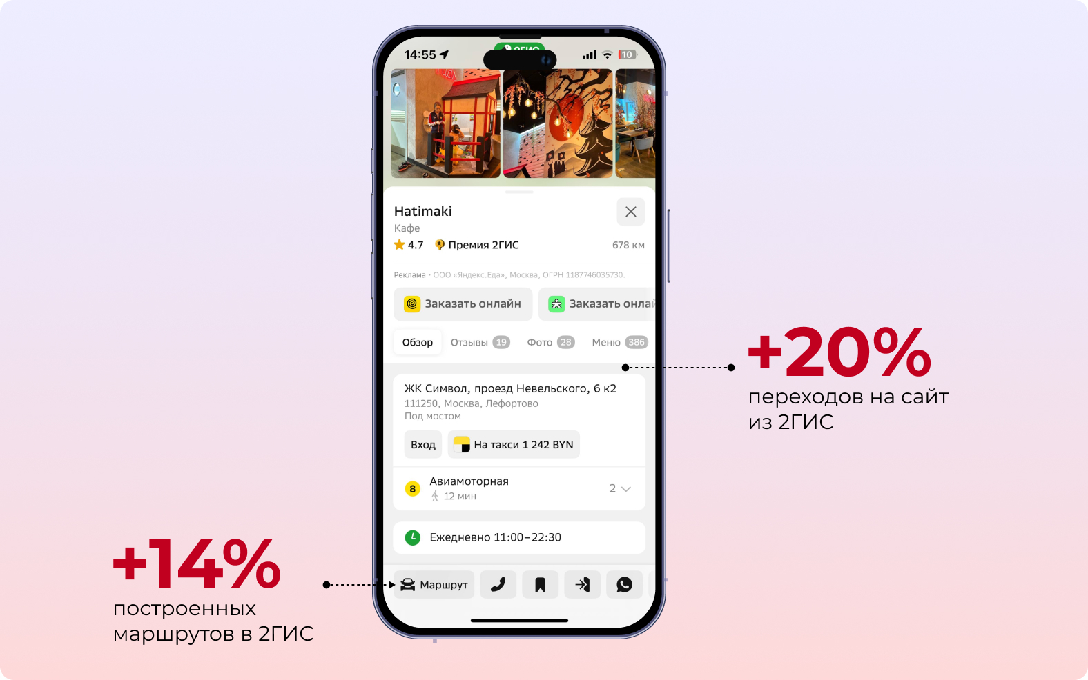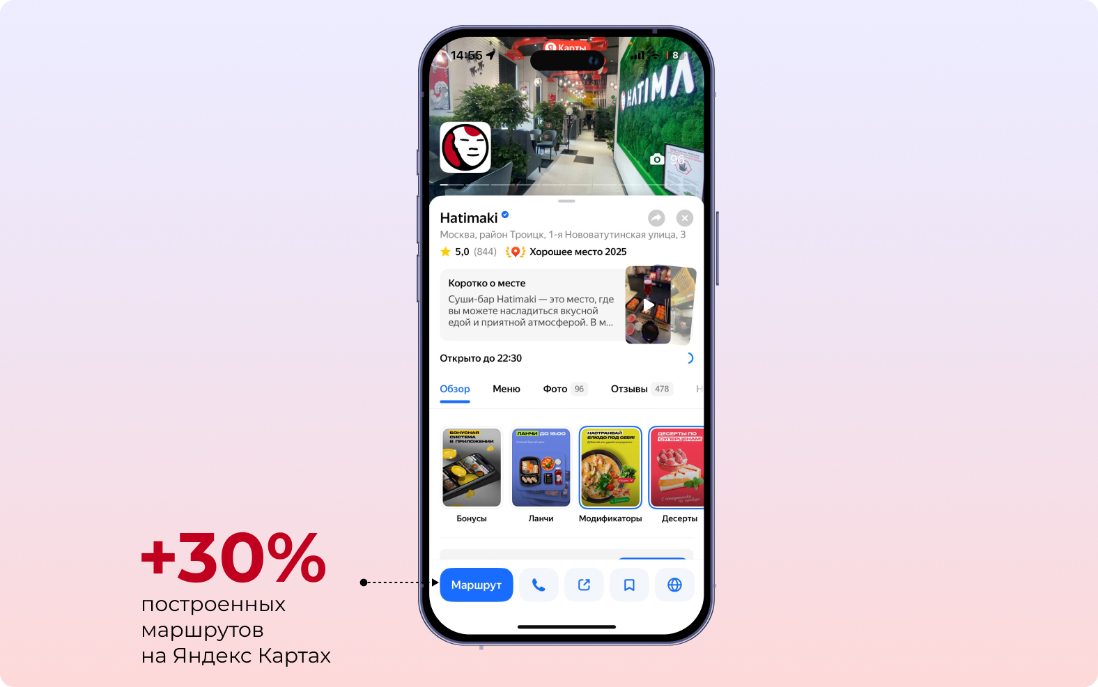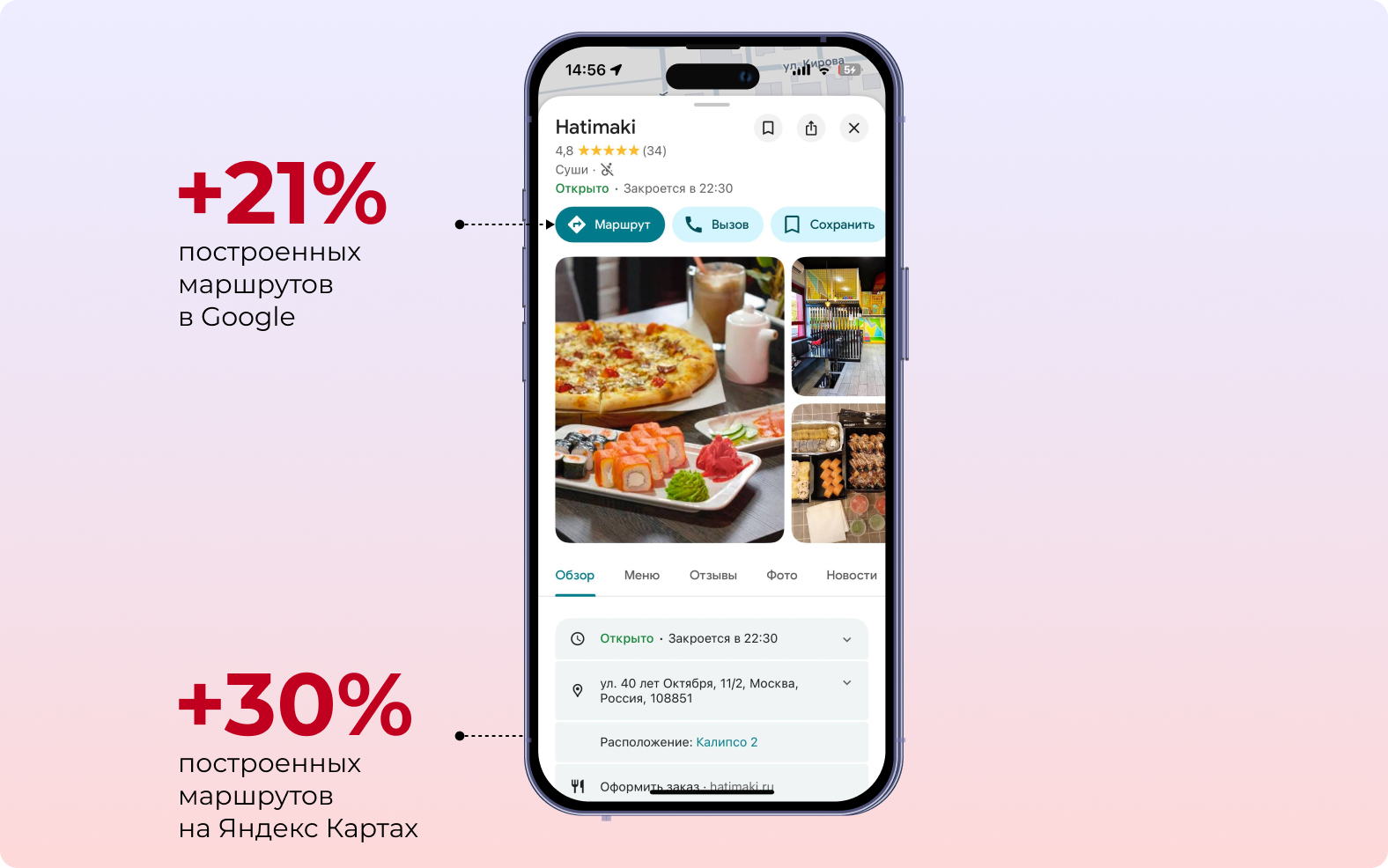 Работа с контентом и данными на картах ожидаемо повлияла на целевые действия в геосервисах — это значит, что пользователи карт стали чаще видеть карточки сети ресторанов Hatimaki в локальной выдаче, строить маршруты, переходить из карточек на сайт и в соцсети.