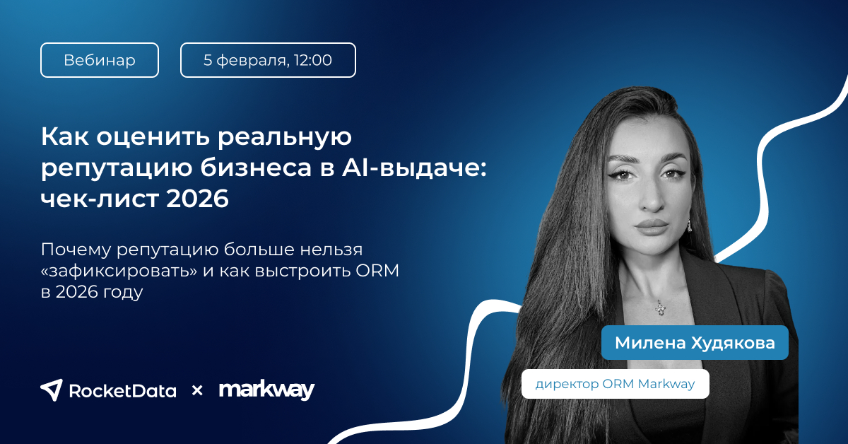 5 февраля RocketData вместе с экспертами из Markway проведет вебинар о репутации бизнеса в новой AI-реальности: поговорим о том, почему репутацию больше нельзя «зафиксировать» и как выстроить ORM в 2026 году.