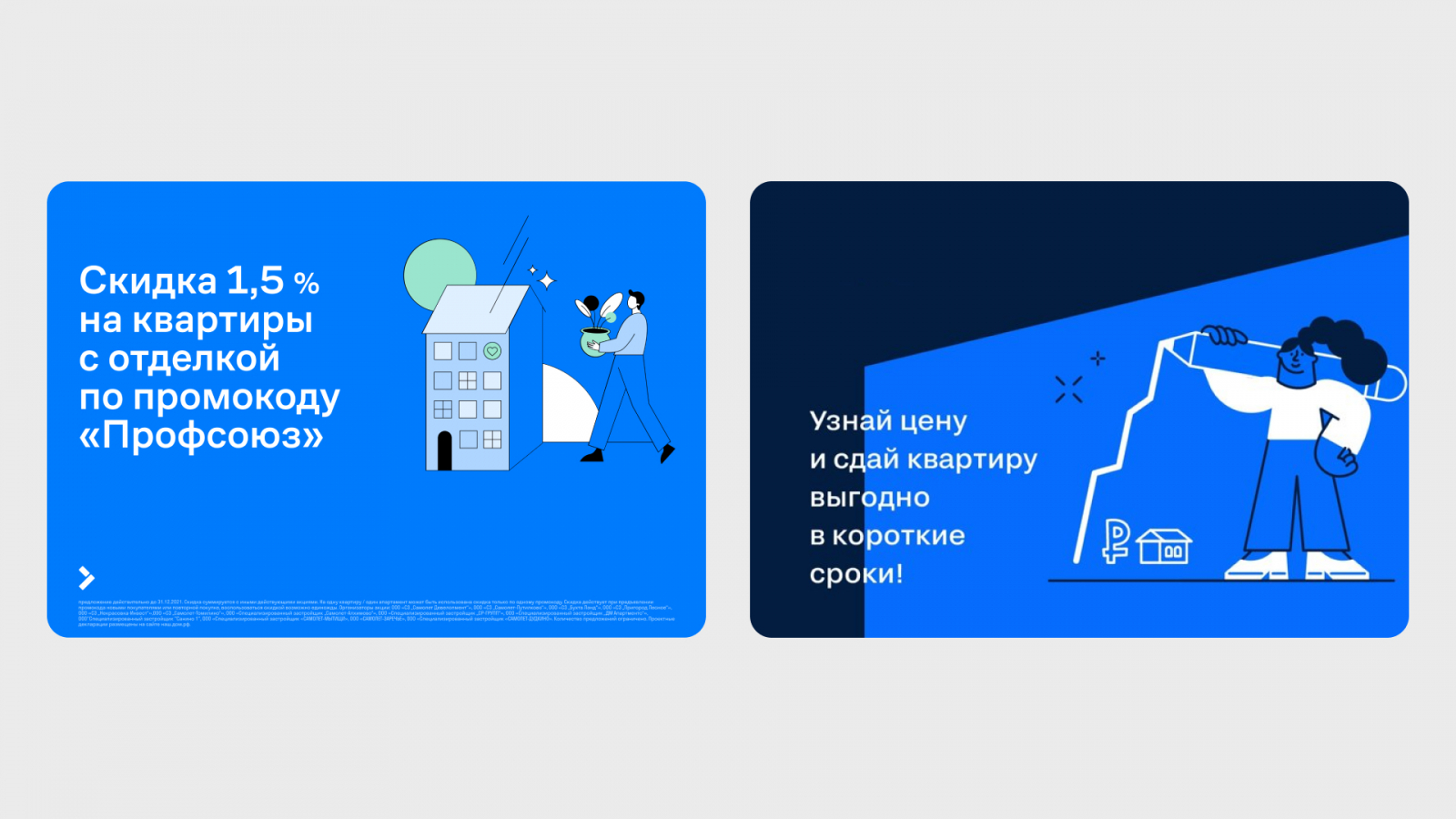 Для примера, сравните рекламу ЦИАН и компании Самолёт. Сможете ли вы сходу отличить чью рекламу вам показывают? Чтобы было интереснее, мы закрасили логотипы.