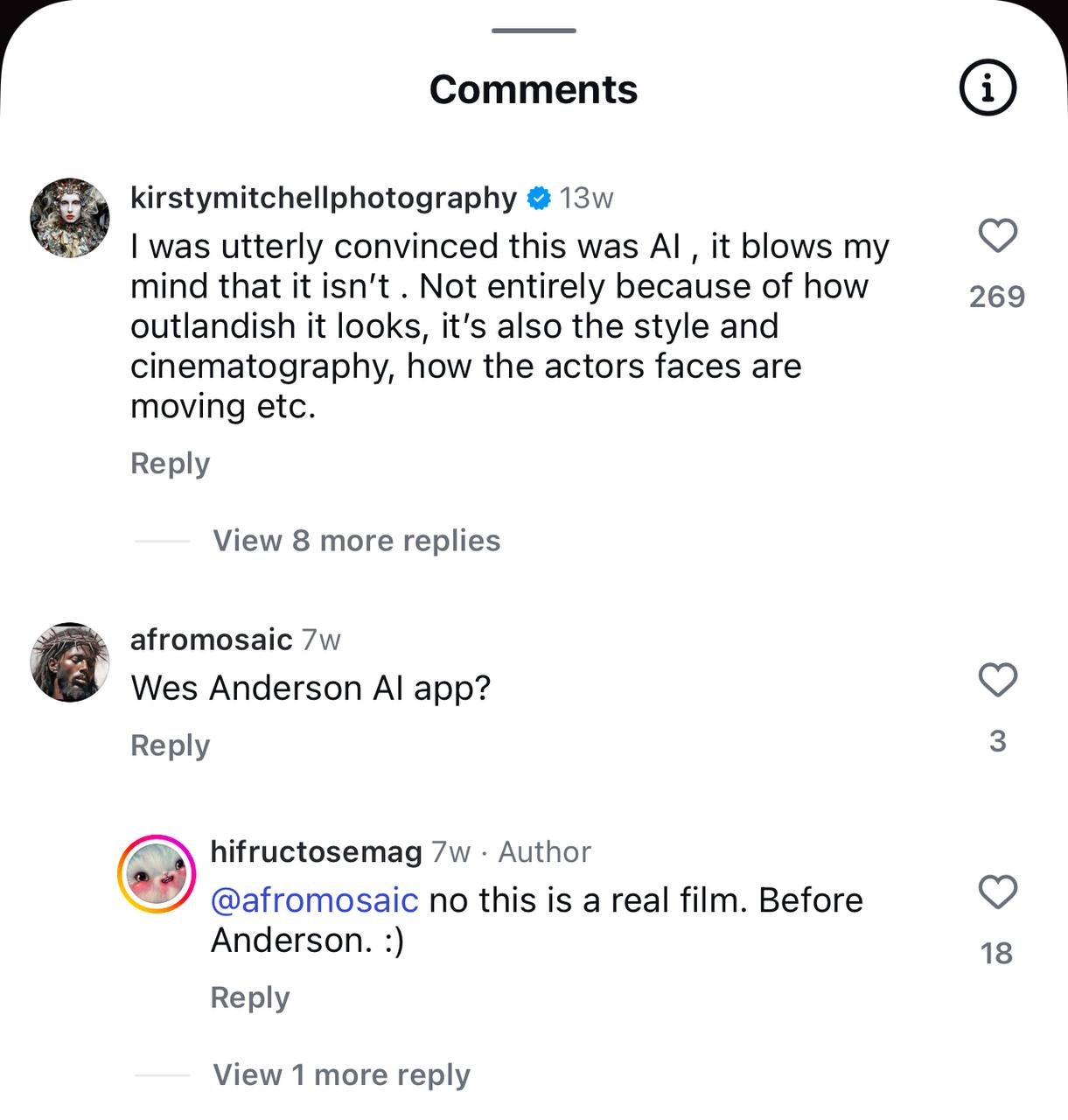 Пример — англоязычный тред с кадрами из фильма "Кин-дза-дза!". Пользователи уверены: это точно сгенерировано ИИ. Аргументы? "Слишком стилизовано", "как будто Уэс Андерсон встретил Безумного Макса", "похоже на покадровую генерацию с наложением пыли". Но, как надеемся вы знаете, это не генерация, а реальное кино. Просто эстетически чуждое современному зрителю, привыкшему к шаблонам Sora, Midjourney, Kling (и далее до бесконечности).