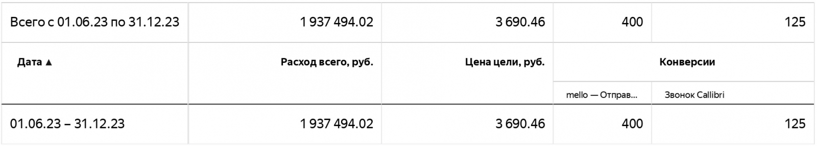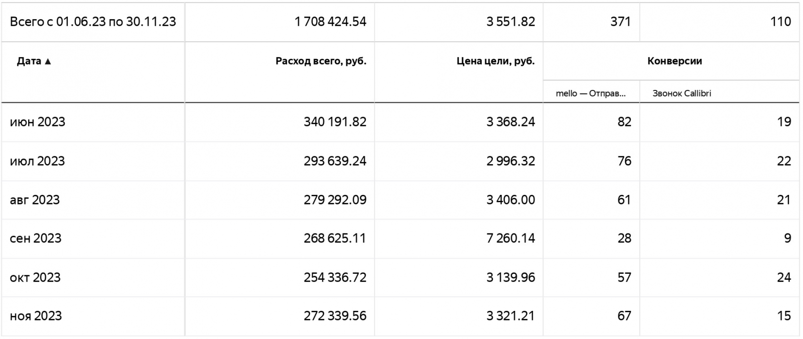 За 2023 год мы привели 1 022 конверсии по 2 700 руб. и выполнили поставленные перед нами задачи: спрос и объем трафика выросли, со временем качество заявок только растет. Клиент доволен.