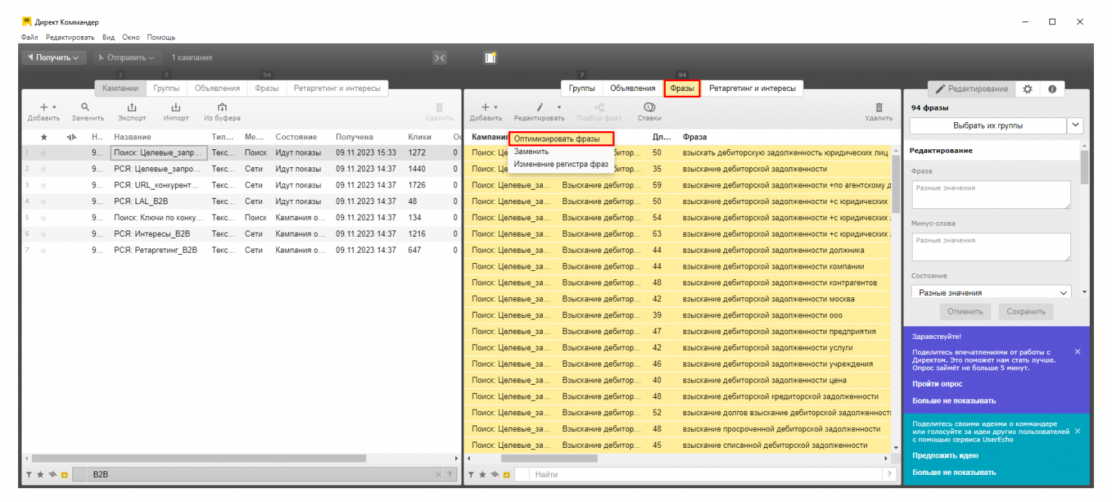 Далее во вкладке «фразы» выберете редактирование — «оптимизировать фразы» и проведите склейку дублей и кросс-минусовку (если кросс-минусовка нужна лишь для части ключей, то выделите их отдельно). После выполнения команды к каждому ключевику будут добавлены минус-слова, а дубликаты автоматически удалятся.