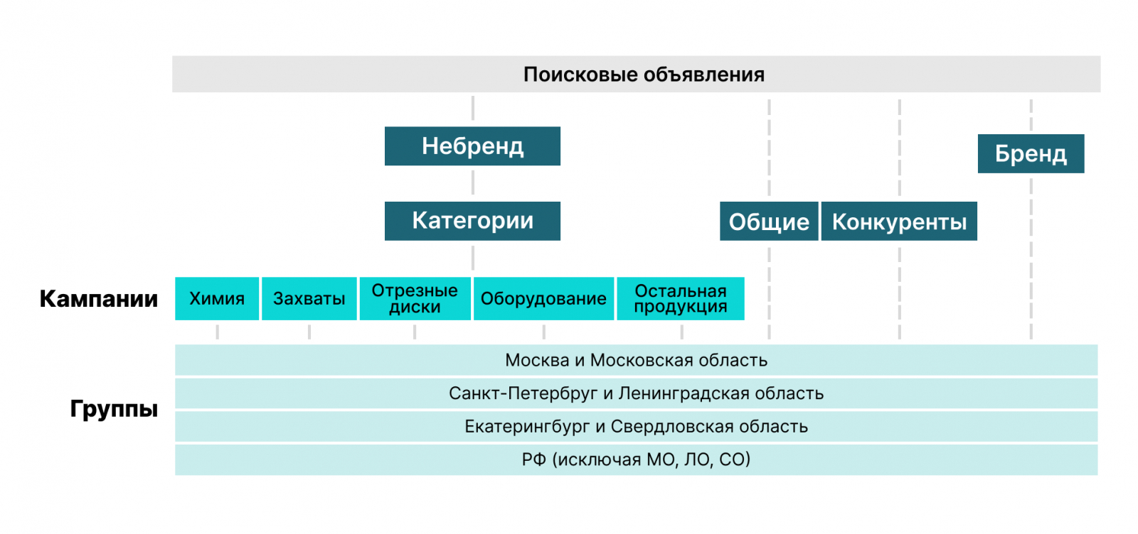 Благодаря такой структуре мы смогли минимизировать дробление направлений на уровне кампаний. Это позволило сконцентрировать больше бюджета в рамках одной РК для стабильной работы алгоритмов Яндекса.