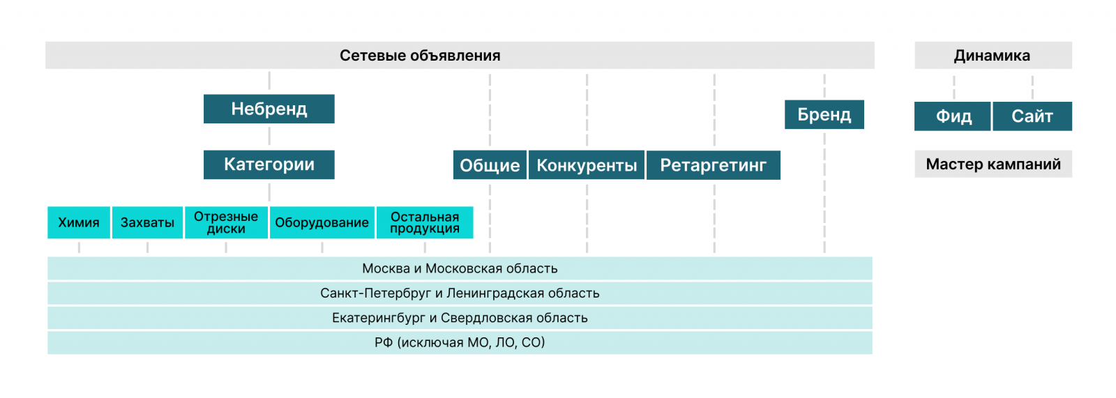 Сразу продумали структуру аккаунта на первый месяц. И тут стоит отметить вот что: нам предстояло работать сразу с несколькими ключевыми для клиента направлениями и ГЕО, часть из которых — приоритетная.