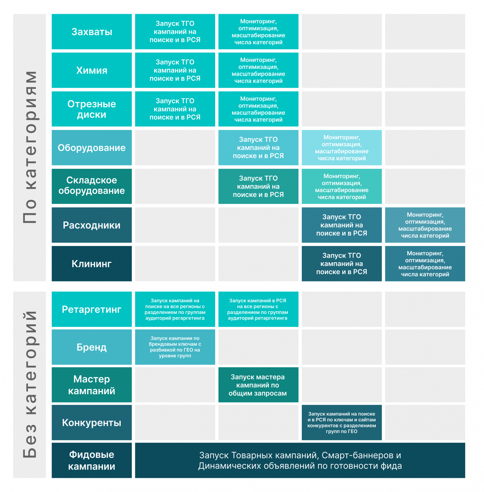 Мы подстраховались и построили диаграмму Ганта с таймлайном по запускам на ближайшие пару месяцев. Сначала — работа с фокусными категориями: захваты, химия и отрезные диски через ТГО на поиске и в РСЯ. После — дозапуск новых форматов и направлений.