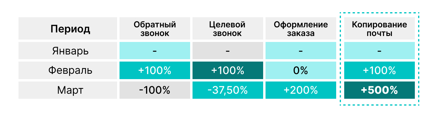 Перед тем, как окунуться в многостраничный мир фидов, взглянем на весеннюю динамику. Если сопоставить статистику марта и двух прошлых месяцев, то ощутимого прироста по конверсиям не наблюдалось. При этом, что интересно, заметно увеличилось число копирований почты.