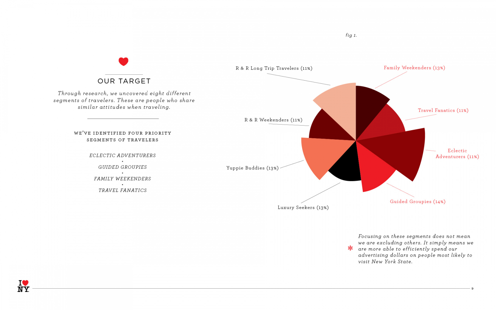 В брендбуке штата Нью-Йорк «I LOVE NEW YORK» приведен портрет целевой аудитории — 8 типов путешественников штата: