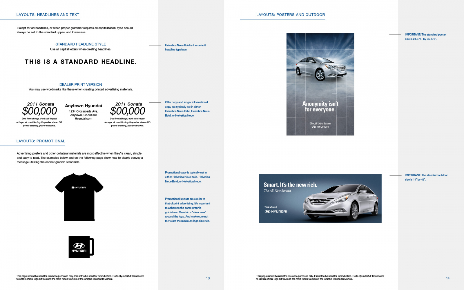Брендбук Hyundai насыщен энергией, он будто заряжает при взгляде на него. В нём показаны яркие цвета и смелые формы, от которых так и веет духом современности. Они помогают компании выделиться на рынке автомобилей. Hyundai создаёт эмоциональную связь со своим клиентами, вдохновляет их через свой фирменный стиль.