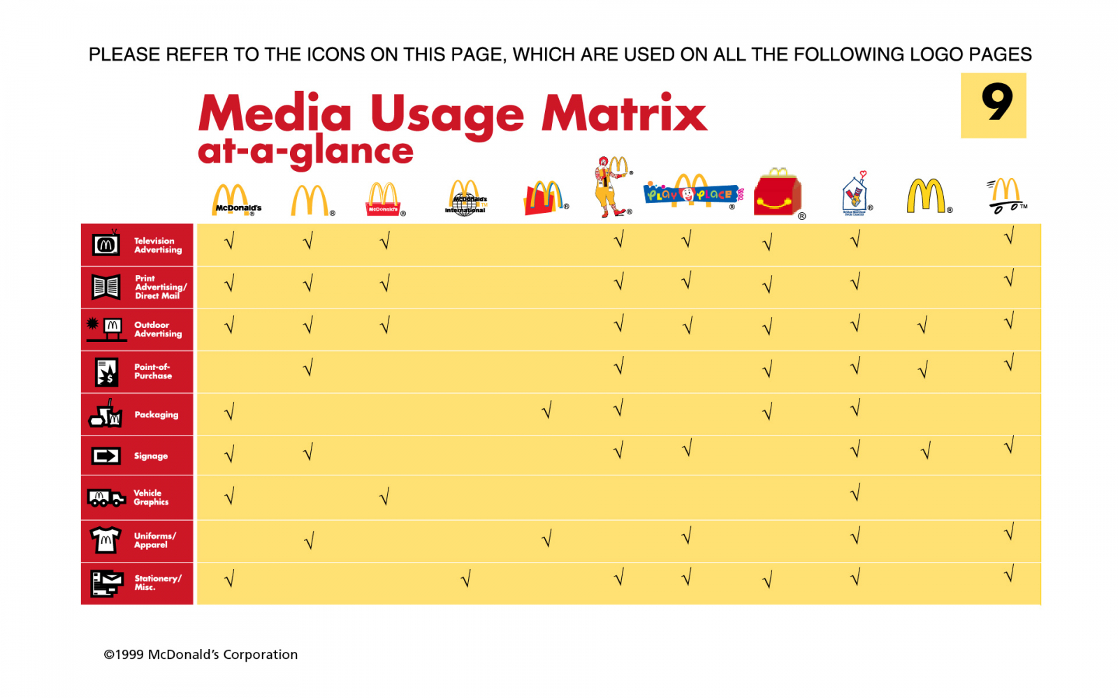 Брендбук Макдональдс. Детство, счастье, беззаботность, удовольствие – всё это до нас доносит брендбук американского фастфуда. Цвета, логотип и формы, связанные в наших головах с едой и семьёй делают McDonald's легко узнаваемым и привлекательным для аудитории.