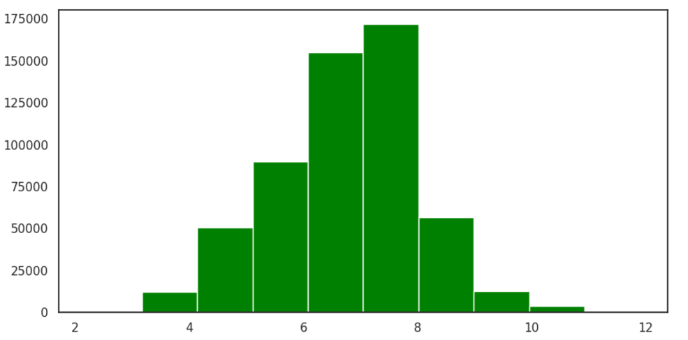 plt.hist(np.log(logs_df_clean['revenue']), bins=10, color='green', edgecolor='white'))