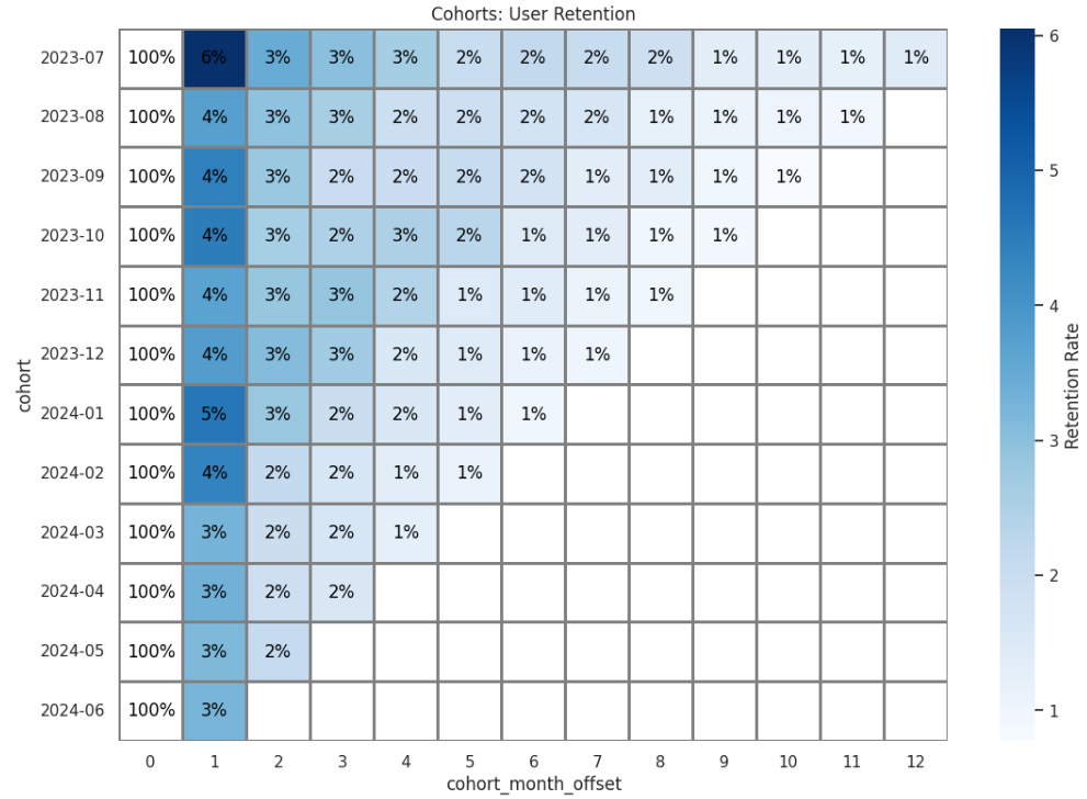 Одним из удобных способов анализа удержания является визуализация данных в виде тепловой карты, где каждая строка представляет собой когорту, а столбцы — это месяцы после первой покупки.