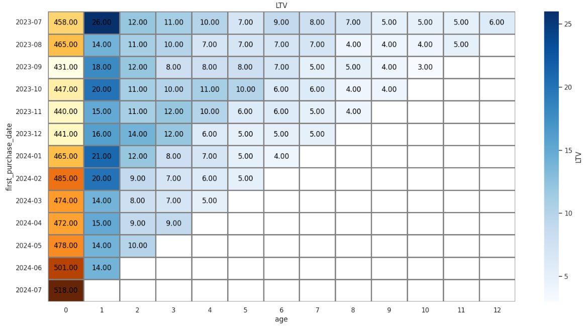 На тепловой карте строки представляют собой когорты (группы клиентов по дате первой покупки), а столбцы — количество месяцев, прошедших с первой транзакции. Ячейки отражают значение LTV.