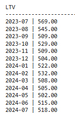В нашем примере у большинства строк LTV быстро падает после 2–3 месяцев, что может говорить о необходимости дополнительных усилий в удержании клиентов, таких как программы лояльности или таргетированное взаимодействие.
