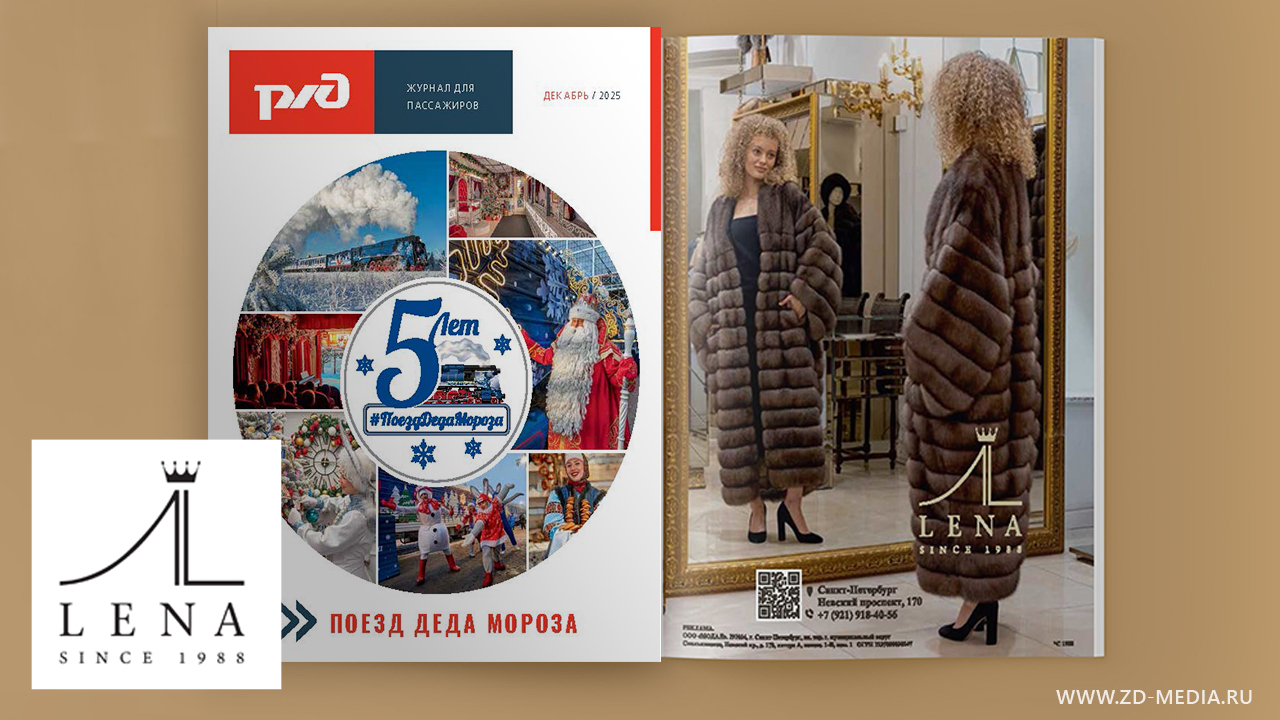 В декабрьском номере бортового журнала «РЖД» разместили имиджевую рекламу меховой компании «LENA» — производителя меховых изделий с уникальным дизайном с 1988 года.
