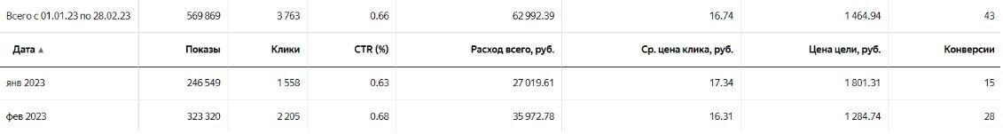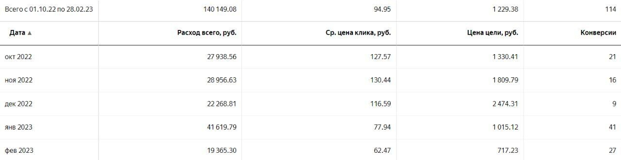 Уже в январе мы увидели, что количество лидов возросло (скриншот ниже), а их стоимость уменьшилась. В феврале результаты оказались еще лучше! Что интересно, рекламный бюджет даже не был потрачен весь — Яндексу было достаточно того, что эти средства просто были на аккаунте.