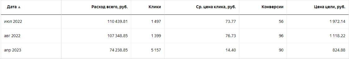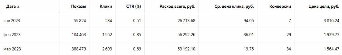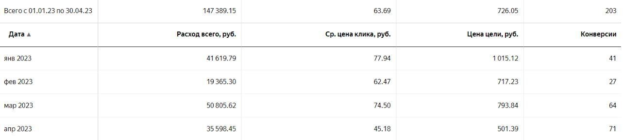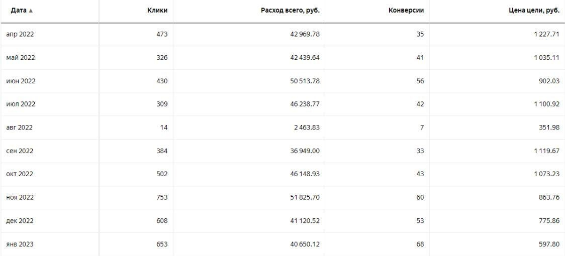 До запуска стоимость лида составляла около 1000 р. Для этой ниши — нормальная цена. В январе 2023 г. мы начали добавлять МК с различными таргетингами к поисковой РК. Тогда стоимость лида начала падать. К апрелю она достигла стоимость в 500 р.