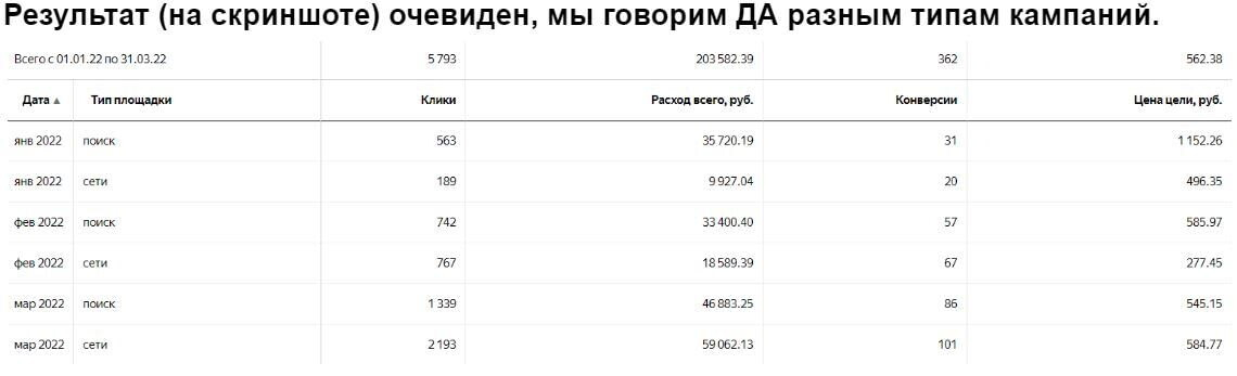 Мы заметили, что результаты становятся лучше, если в рамках аккаунта мы используем не один тип рекламных кампаний, а сразу несколько.