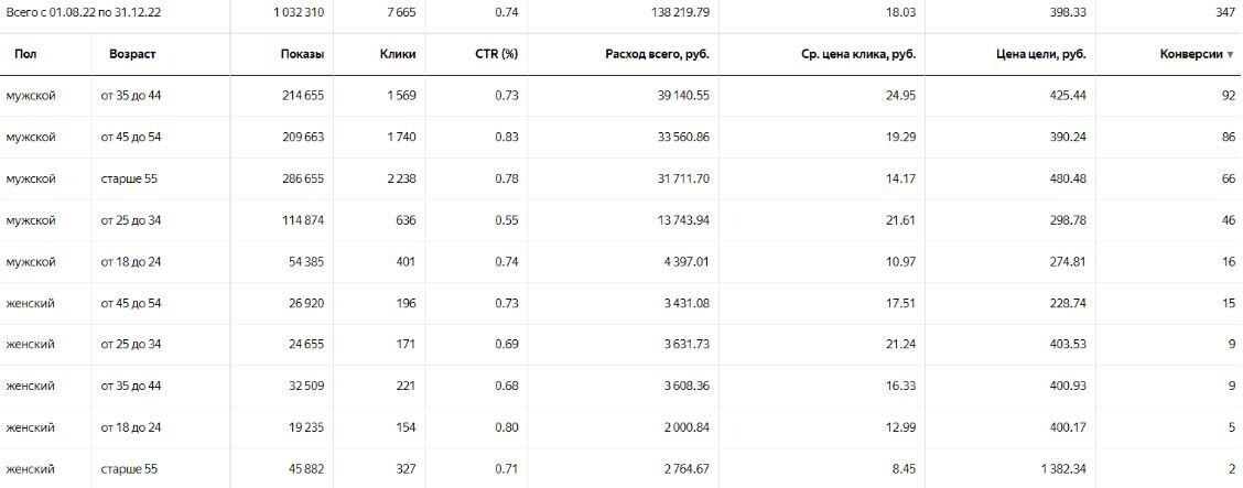 Откройте Мастер отчетов и посмотрите статистику в разрезе по полу и возрасту ЦА. Там будет видно, что мужчины и женщины в возрасте младше 18 лет съедают 30% бюджета, и приносят лиды по цене в 3100 р. Женщины в возрасте старше 55 лет тратят еще 15% бюджета, а цена лида у них 2200 р.