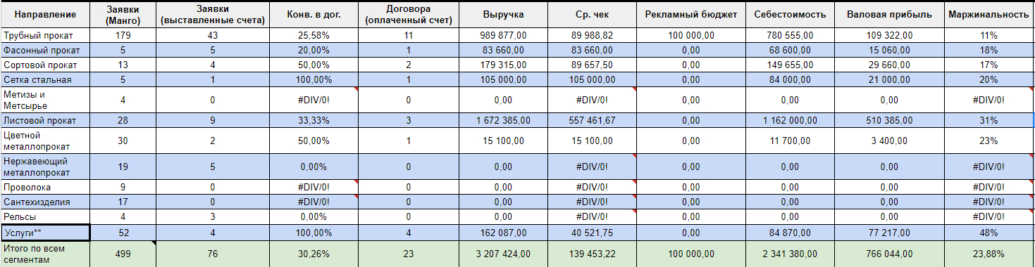 У нашего клиента, который занимается металлопрокатом с упором на трубы разных диаметров и стали, есть правило: считать деньги и стоимость нового клиента с разных каналов привлечения.