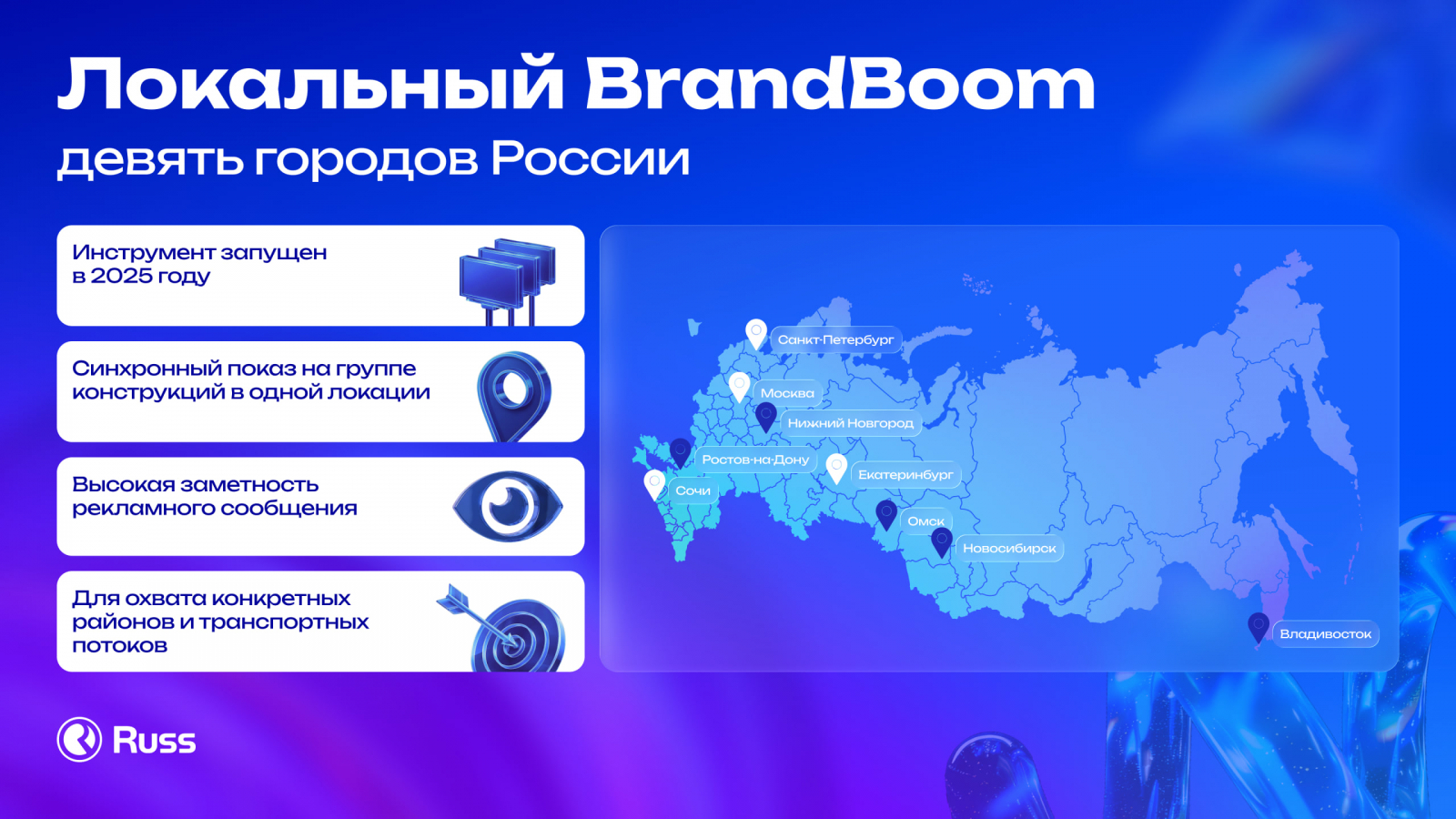 Группа Russ (входит в RWB) запустила Локальный BrandBoom во Владивостоке, Ростове-на-Дону, Новосибирске, Нижнем Новгороде и Омске. Таким образом, рекламодатели могут использовать данный инструмент в девяти городах России.