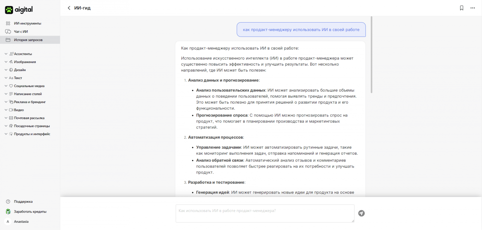 Когда мы выпустили первых ИИ-ассистентов, увидели, что нам не хватает главного — помощника в работе с нейросетями и с нашим сервисом. Мы назвали его ИИ-гид и запрограммировали помогать пользователям писать промпты. Но в процессе разработки поняли, что он также может подсказывать пользователям, как решать задачи с помощью Aigital.