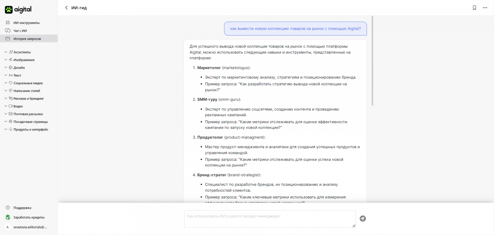 Например, я спросила ИИ-гида, как вывести новую коллекцию товаров на рынок с помощью Aigital, и он подсказал ассистентов и навыки, которые помогут в этом.
