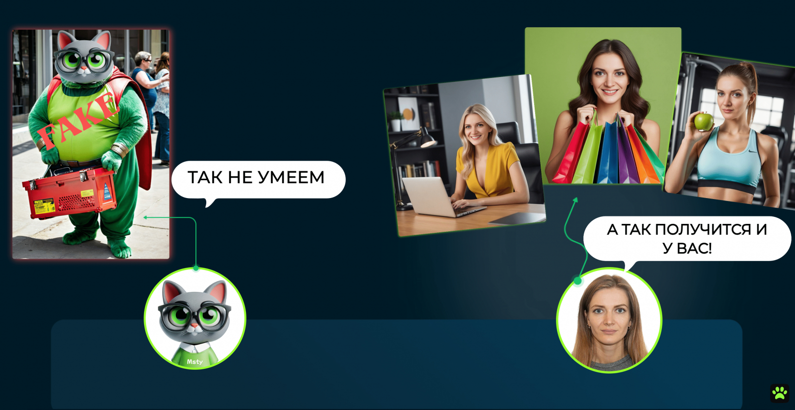Также вы можете персонифицировать свой бренд, сгенерировав персонажа в навыке «Фотосток: Люди», чтобы использовать его для рекламных креативов, баннеров и контента в соцсетях. Например, фото для своих ИИ-ассистентов мы сгенерировали в навыке «Фотосток: Люди», а с помощью «Аватарки» можем представлять их в разных образах на сайте и в телеграм-канале.