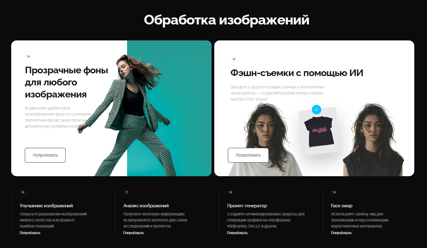 Вторым важным пунктом, который мы хотели подсветить, была преемственность с первой версией сайта: нейронка по прежнему помогает нам в создании контента для сайта. Поэтому визуал и тексты мы создавали в Aigital — в диалогах с ИИ приходили к нужным фразам, а в «Фотостоке» и генерациях «По референсу» к нужным эстетичным визуалам, и в футболку Balenciaga модель тоже переодевали в своих приложениях.