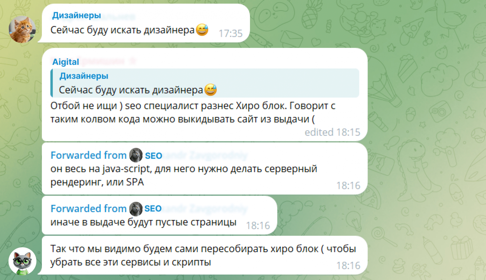В-третьих, мы решили вынести опыт реальных пользователей не только в отзывы, но и в другие блоки сайта. Так, например, идея чата, в котором команда обсуждает создание презы, родилась из разговора с пользователем, который использует Aigital в своем проекте именно так.