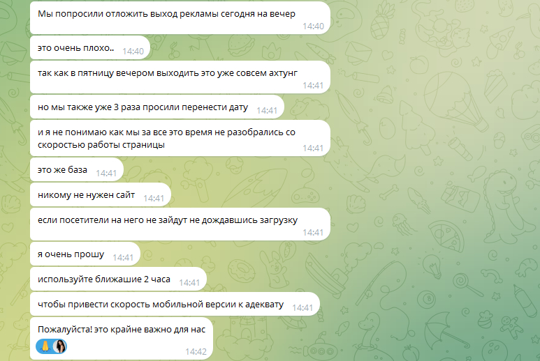 Но в день, когда должна была выйти реклама, мобилка все еще грузилась больше 30 секунд. До выхода сторис оставалось несколько часов, поэтому мы методом исключения стали отключать разные блоки на сайте. С каждой новой версией сайт становился все меньше, нам пришлось отказаться от половины контента о нашем продукте.