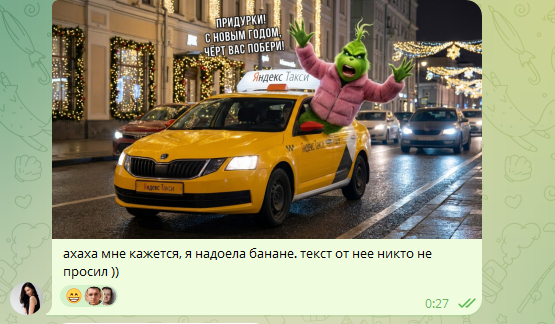 Генерить персонажей и подгонять ИИ-креативы под московские реалии довольно весело. Нейронка и сама иногда подкидывала мемы, видимо, устав от моих надоедливых просьб сгенерировать Гринча то тут, то там.