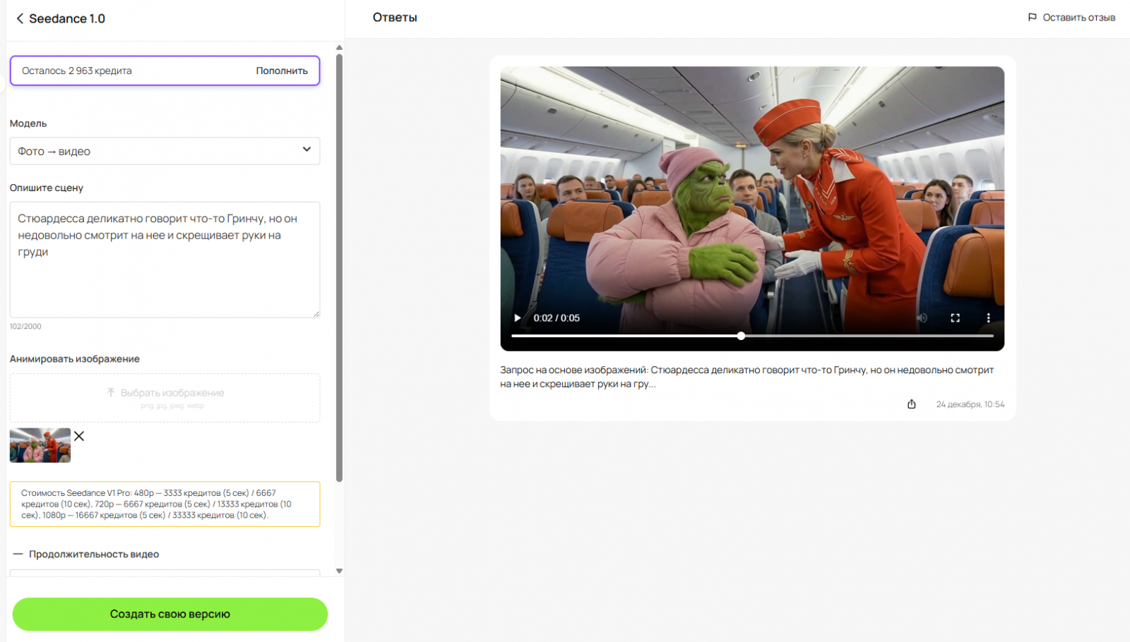 Чтобы оживить полученные иллюстрации, я использовала Kling и Seedance, тоже в Aigital. С Veo 3 у меня договориться не получилось, она генерирует сразу с озвучкой, но навыков промптинга для работы с ней у меня недостаточно, а команду отвлекать не хотелось. Seedance и Kling максимально просты в использовании, я лишь описывала действия, которые хочу видеть на экране. Например: