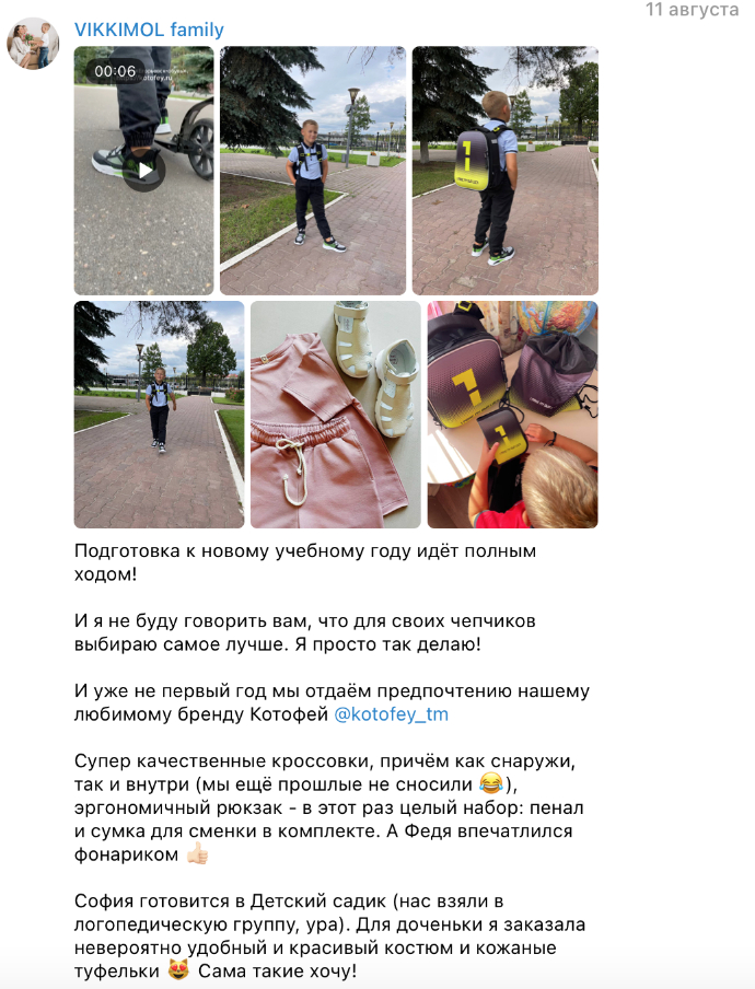 Расскажем о нашем опыте подбора блогеров для сотрудничества с брендом детской одежды и обуви «Котофей». Конечно, для продвижения такого бренда нам подходят блогеры с семейным лайфстайл-контентом. Но публикации показали, что мамы-блогеры мамам-блогерам рознь. С «Котофеем» мы работали ежемесячно, поэтому у нас было пространство для тестирования.