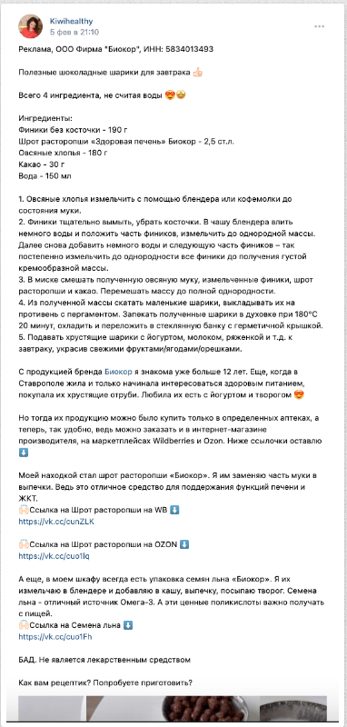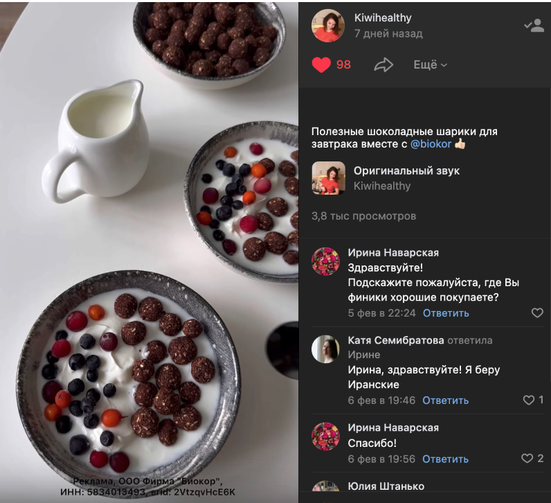 Приведем пример на основе нашего сотрудничества с брендом «Биокор». Бренд специализируется на производстве продуктов здорового питания, и у клиента был запрос на разовые публикации у блогеров, чтобы протестировать такой формат продвижения.