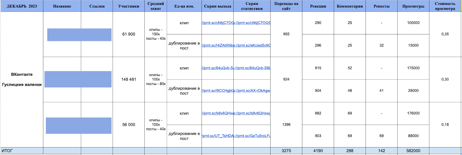 Покажем пример нашей аналитики размещений у блогеров для одного из клиентов :