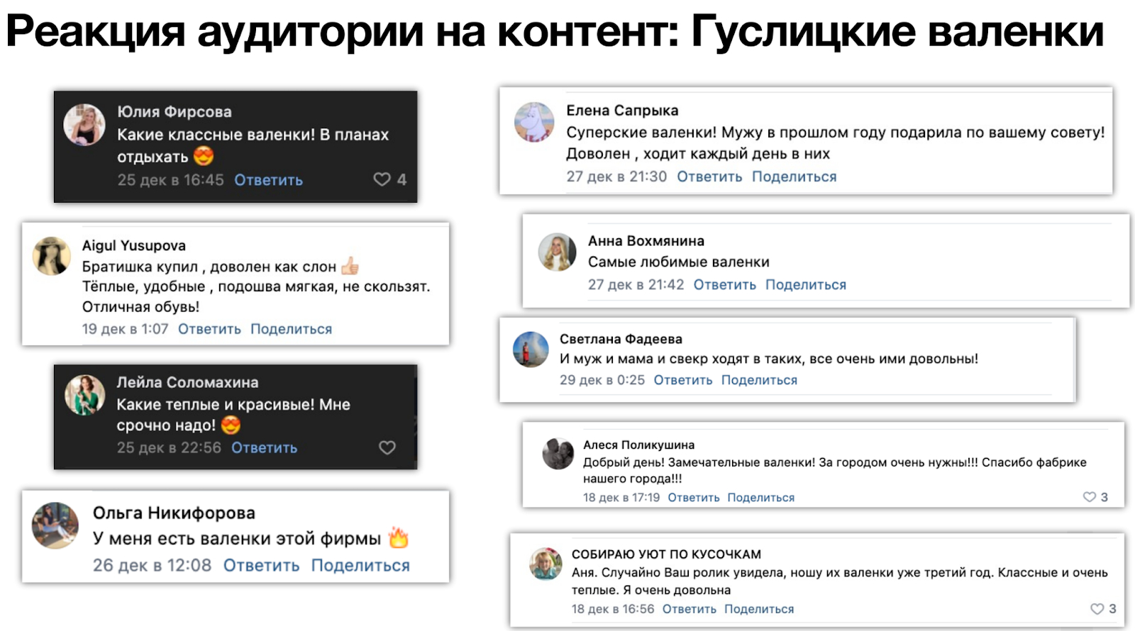 В нашей практике был кейс с брендом «Гуслицкие валенки», когда изначально клиент хотел привлечь к работе инфлюенсеров-мужчин, которые ведут блог про охоту и рыбалку, чтобы рассказать о мужском ассортименте бренда.