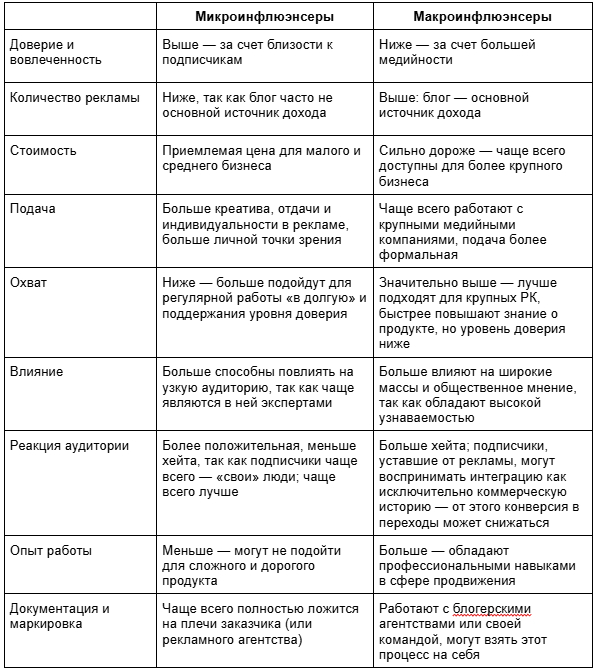 Еще один важный фактор при выборе блогеров — масштаб и цели рекламной кампании. Аудитории микроинфлюэнсеров может не хватить для проведения крупной РК. Если вы хотите быстрого роста охвата и узнаваемости — лучше привлечь крупные блоги. Но это еще не все — подытожим и продолжим в формате таблицы: