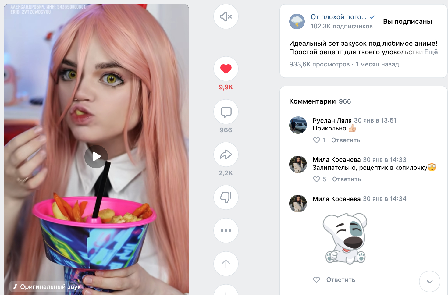- food-блогер: https://vk.com/weatherwasawesome (102 000 подписчиков).