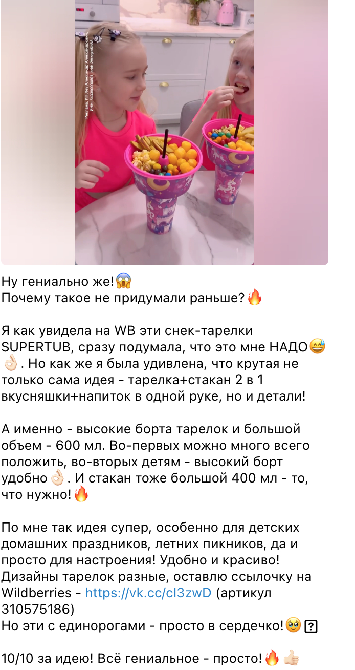 Не так давно мы работали с блогерами от лица нашего клиента — производителя снек-тарелок Supertub, который только вышел на рынок. Подробнее по ссылке: https://ruward.ru/award/2025/371446/.