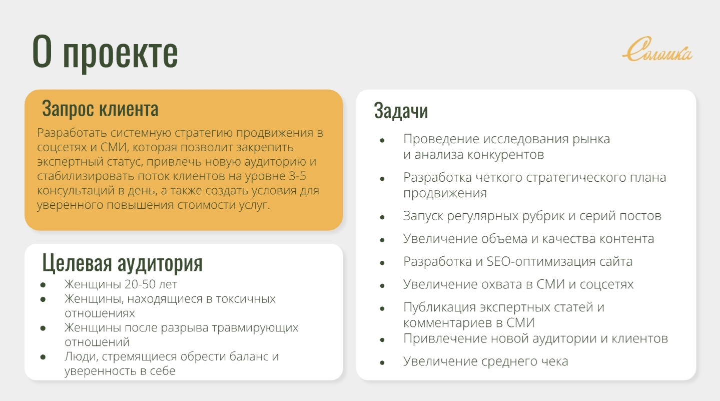 Разработать системную стратегию продвижения в соцсетях и СМИ для закрепления экспертного статуса в нише психологии и созависимости, привлечения новой целевой аудитории и стабилизации потока клиентов на уровне 3-5 консультаций в день с созданием условий для уверенного повышения стоимости услуг.