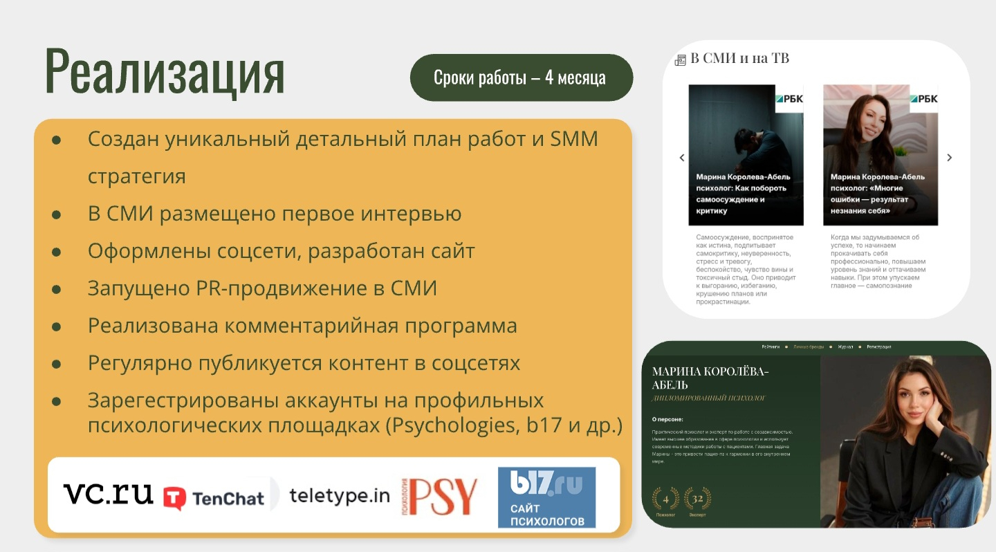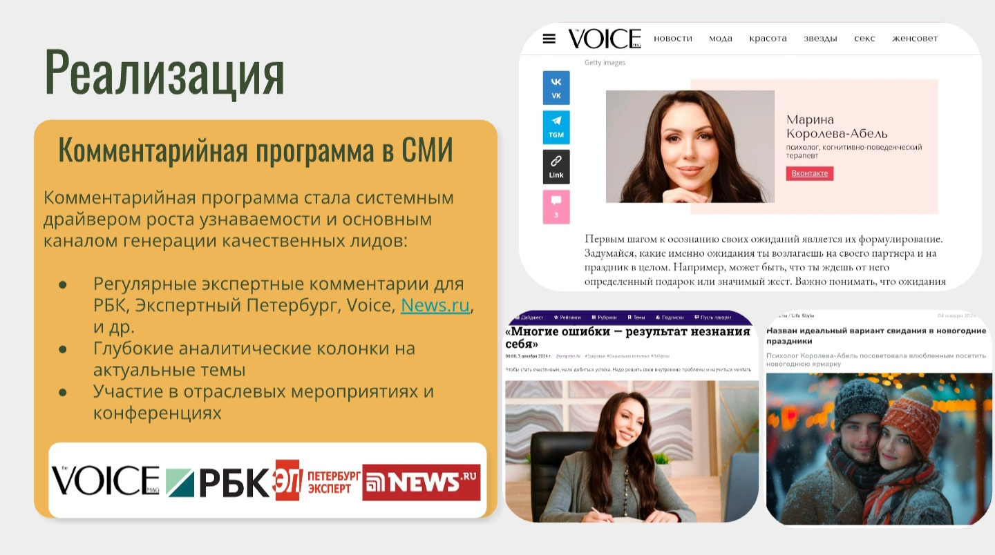 1. PR как социальное доказательство в сфере доверия. В нише психологии, где ключевой фактор — безопасность, системное медиаприсутствие (комментарии, интервью в РБК и др.) работает не на «шумиху», а на подтверждение экспертного статуса и формирование безоговорочного доверия у потенциальных клиентов.2. Комментарийная программа — драйвер «теплых» лидов. Публикации в авторитетных СМИ стали мощным каналом генерации качественных заявок, так как аудитория видит эксперта в момент решения своей проблемы через призму большого издания.3. Инфраструктура — фундамент долгосрочного бренда. Создание сайта, оформление соцсетей и регистрация на профильных площадках ликвидируют «цифровое небытие» и создают контролируемое пространство для диалога с аудиторией.4. Скорость результата при системном подходе. Кейс доказывает, что даже при старте с низкой цифровой видимости можно достичь значительного качественного рывка в узнаваемости и коммерческих показателях за счет продуманной стратегии, а не разовых акций.