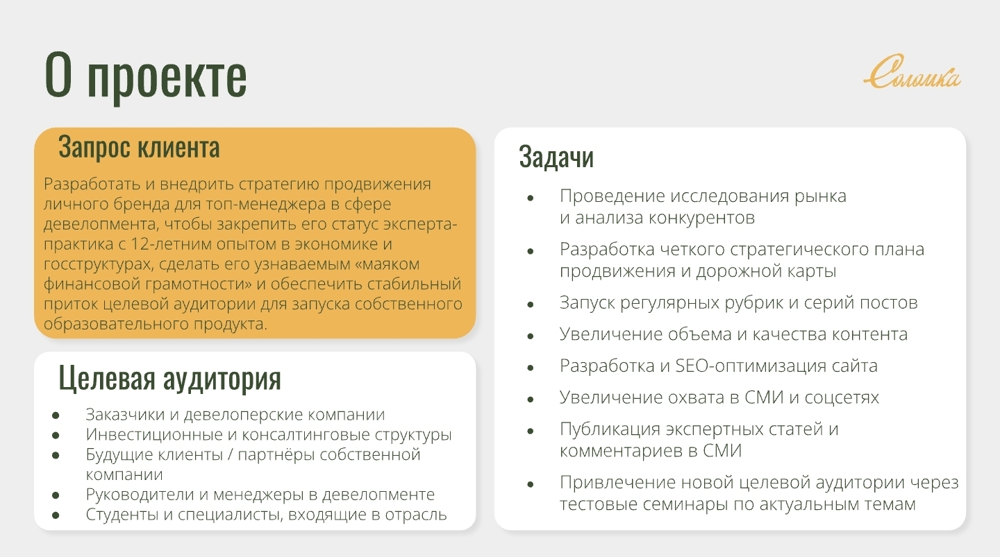 Запрос клиента: разработать и внедрить стратегию продвижения личного бренда для закрепления статуса эксперта-практика, чтобы сделать его узнаваемым «архитектором управленческих систем» в девелопменте и обеспечить стабильный приток целевой аудитории для запуска собственного образовательного продукта.